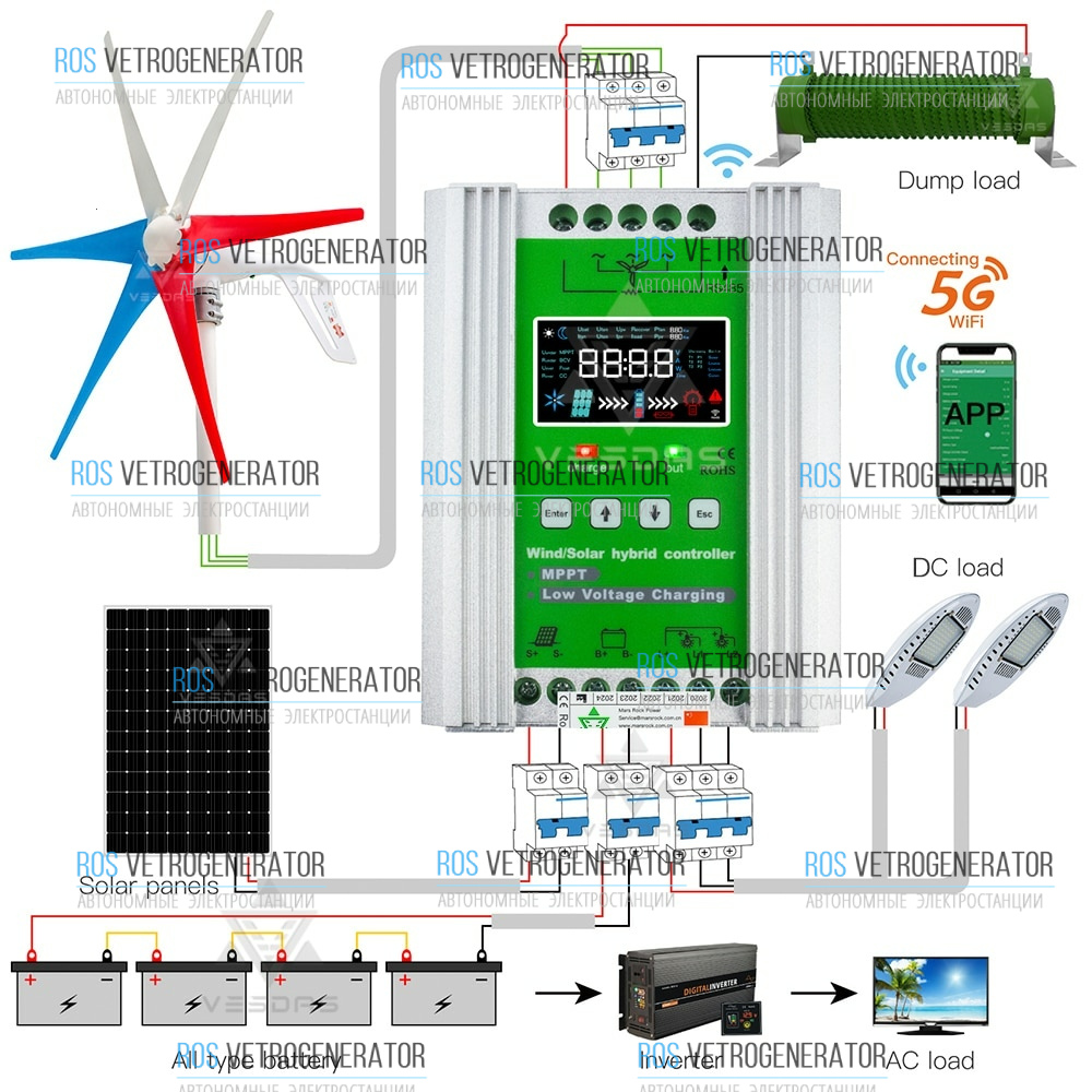 Контроллер RVK G1000/1000W работает в системе 24В и 48В, напряжение системы контроллер определяет автоматически. В комплекте имеется внешний датчик температуры, определяющий точную температуру среды. Можно использовать для одновременного подключения ветрогенератора и солнечных панелей. В комплекте идет баласт для торможения ротора ветрогенератора.